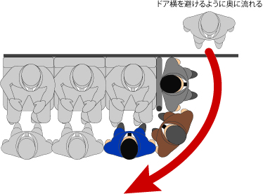 この状態だと、人の流れは滑るように奥へ流れ、混み具合が均一的になるのである。