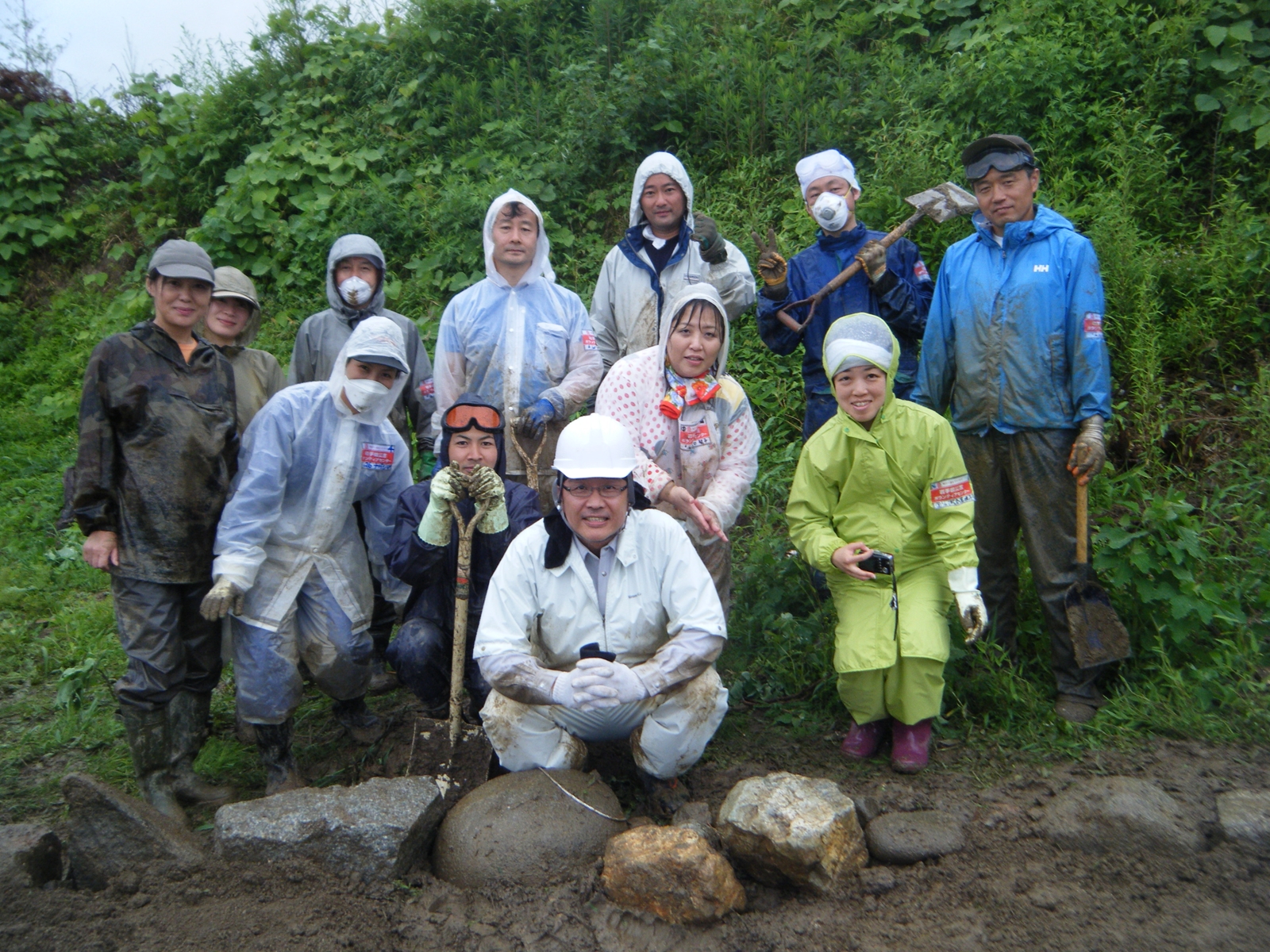 ひまわり畑をつくるために、がれきを撤去する作業を行った。一輪車(ネコ)を使うことも初めてで、ヨロヨロしてうまく動かせず……。迷彩のレインコートを着ているのが嶋津。